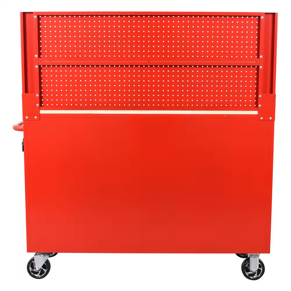 The 52 in. W 10-drawer gloss red mobile workbench cabinet with solid wood top and pegboard will be a versatile storage unit in any workspace. The workbench is constructed of all-welded steel and finished with a gloss red powder coat finish. There is a solid wood top worksurface and a 20 in. H pegboard attachment. Each of the drawers glides on 120 lb. Rated ball-bearing slides that have soft-closing feature to ensure your drawers do not slam shut. The workbench also has an integrated power strip with 6 outlets, (1) USB-a and (1) USB-c port to conveniently charge any tools or electronic devices. The entire workbench can easily move around your space on 5 in. X 2 in. Casters and aided by an ergonomic push handle.