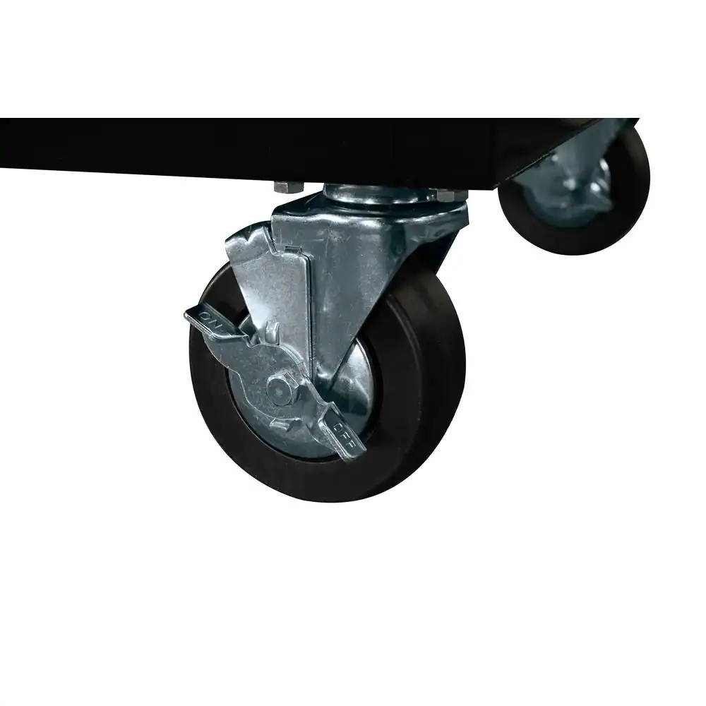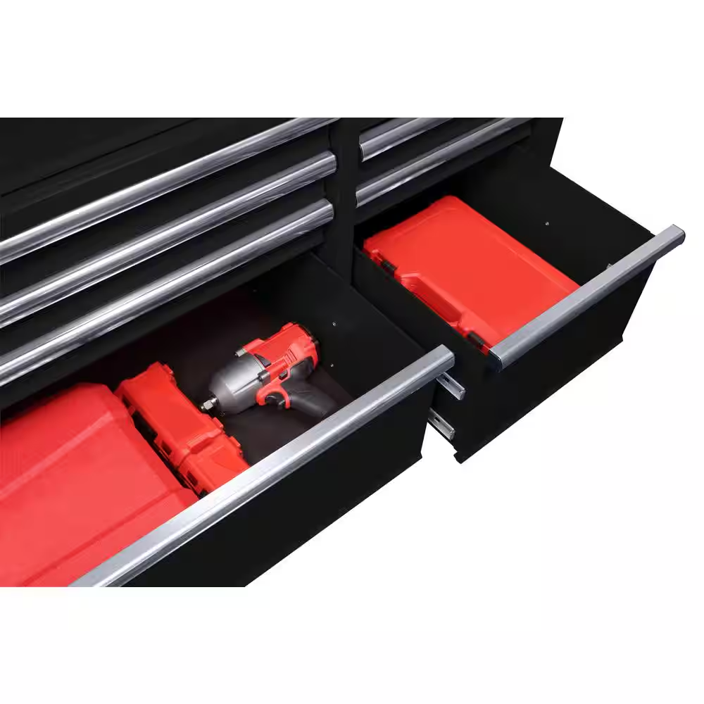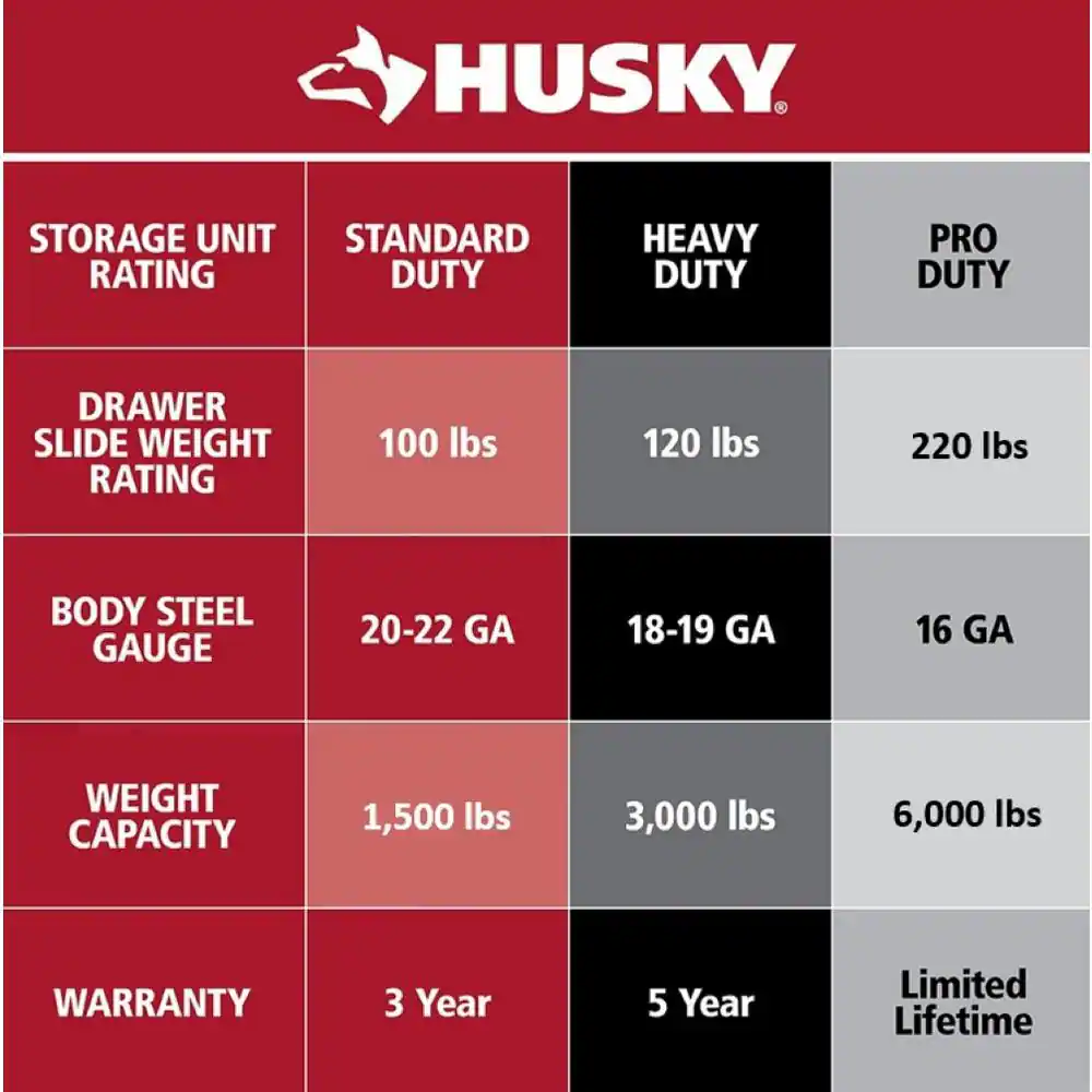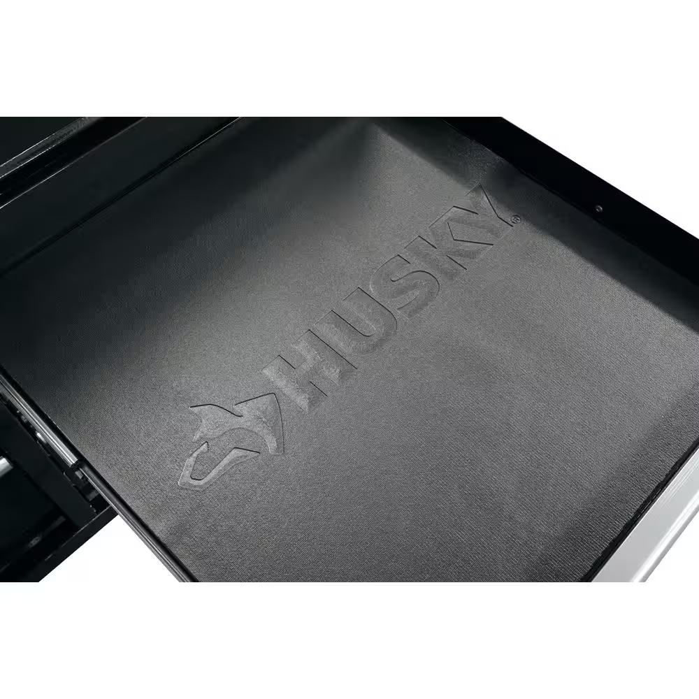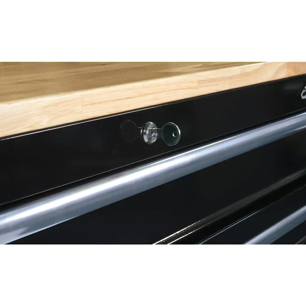 Built for its functional work space and large storage capacity the husky 52 in. 9 drawer 24.5 in. D mobile workbench is the perfect combination for your tool storage system. This mobile work center has large, 5 in. x 2 in. casters and a steel tubular side handle, which allow you to easily move it, even when fully loaded. Each drawer is equipped with 100 lbs. rated ball bearing slides. The top long drawer and 2 deep bottom drawers have double sets of 100 lbs. rated soft closing slides to enable you to store your heavier bulk items. It is constructed with heavy 21-Gauge steel and is strong enough to support 1,500 lbs. and has 23,362 cu. in. storage capacity. The 1 in. thick solid wood top is sealed with a protective coating to protect it from the elements.